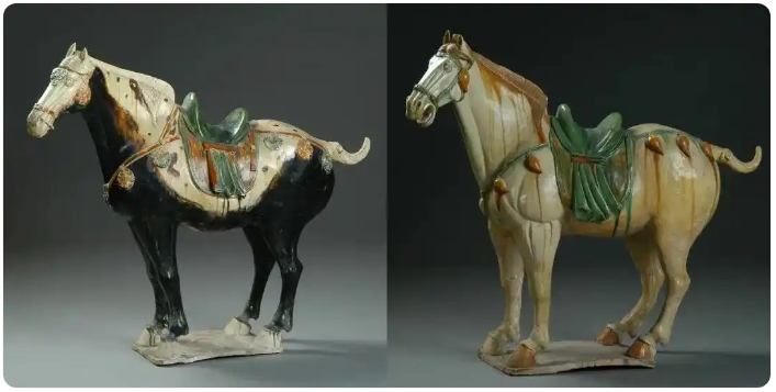 唐三彩黑釉馬(左)、唐三彩貼杏葉飾白釉馬(右)。圖源:洛陽博物館