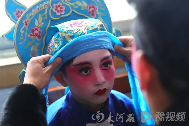 為了這場(chǎng)表演,耿諾一早上8時(shí)就跟隨父親來(lái)到會(huì)內(nèi),化妝、扮相、勒腿。雖然年紀(jì)小,但他已是“老戲骨”。“我爸、我叔、我爺爺都會(huì)踩高蹺,小時(shí)候看著很威風(fēng)、很帥,我就跟著爸爸學(xué)了。”耿諾一說(shuō)。