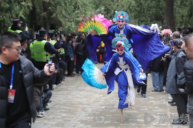 13時(shí)30分許,東后街社火隊(duì)的出現(xiàn)將文治閣的氣氛推向高潮。高蹺隊(duì)員在歡呼聲中表演了前空翻、后空翻等高難度動(dòng)作。壓軸出場(chǎng)的則是耿曉孟與耿諾一父子聯(lián)袂表演的《撲蝶》,兩人動(dòng)作協(xié)調(diào)一致,靈動(dòng)傳神,現(xiàn)場(chǎng)叫好聲不斷。