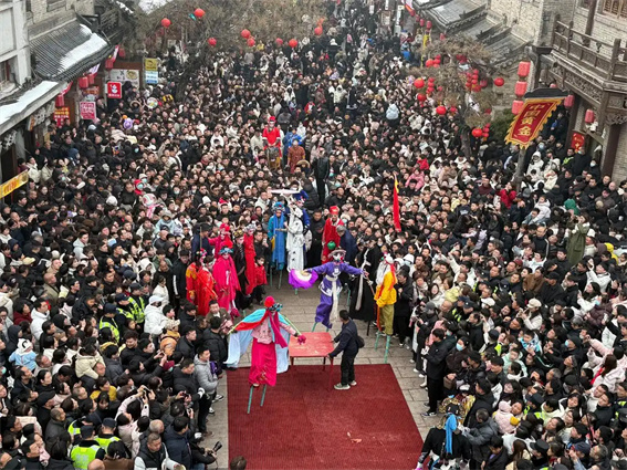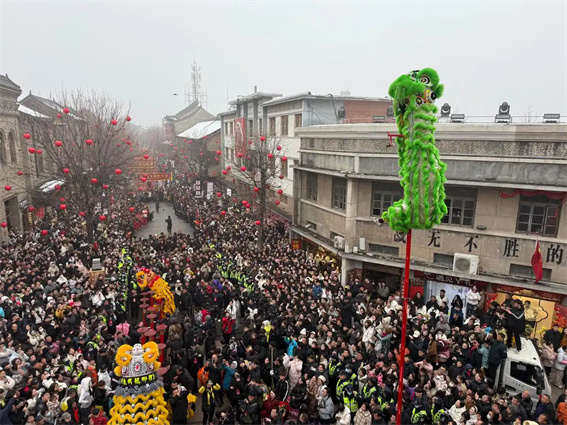 正月十五、十六這兩天,鶴壁?h古廟會(huì)迎來(lái)了高潮。街頭巷尾,人潮把年味兒擠得滿滿當(dāng)當(dāng),高蹺踩著鼓點(diǎn)走,竹馬跟著嗩吶跑。大家烏泱泱擠在一塊兒扭秧歌,樂(lè)在其中,社火巡游隊(duì)伍一眼望不到頭。
