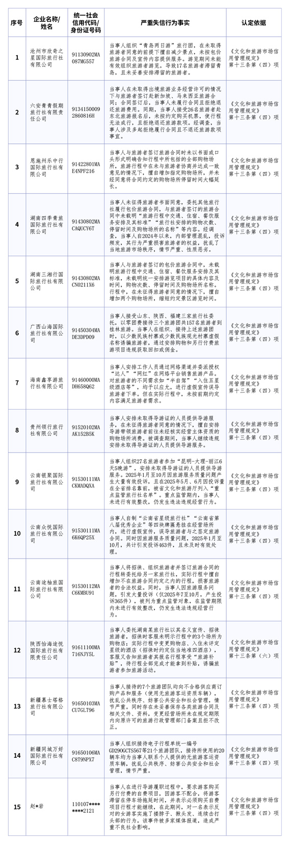 旅游市場秩序集中整治工作開展以來,各地依法查辦了一批重大案件,并依法依規(guī)開展失信主體認(rèn)定,截至2026年3月底,全國文化和旅游市場共認(rèn)定失信主體1655個(gè)。為落實(shí)《國務(wù)院辦公廳關(guān)于進(jìn)一步加強(qiáng)旅游市場綜合監(jiān)管的通知》有關(guān)要求,提升信用監(jiān)管效能,營造誠信、公平、有序的旅游市場環(huán)境,現(xiàn)對旅游市場秩序集中整治嚴(yán)重失信主體典型名單(2026年第一批)予以公布。