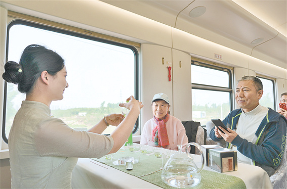 “這次是女兒給我們訂的票,想著和老伴一起出來(lái)轉(zhuǎn)轉(zhuǎn),沒(méi)想到一路上不僅安排了地方特色表演和采茶品茶活動(dòng),還準(zhǔn)備有地方特色美食,整體行程很愜意、很舒服。”來(lái)自陜西的沈女士說(shuō)。