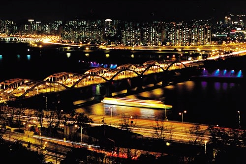 漢江是首爾的象征,總長500多公里的漢江江邊到處有美麗的公園。它是連接龍山區(qū)漢江路和銅雀區(qū)本洞的橋,寬36.8米,長1005米,是跨越漢江島的漢江最早的橋梁。以前曾成為漢江公路橋、第一漢江橋,1984年11月7日為了與路名漢江路一致,將橋名改為漢江大橋。每天大概有15萬人在這里舉行文化和體育活動(dòng)。夏季的夜晚,為了避暑,很多人甚至睡在江邊。