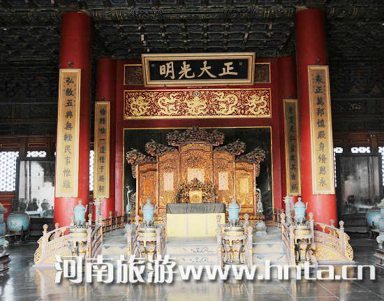 外朝是皇帝處理政事的地方,主要有三大殿:太和殿、中和殿、保和殿。其中太和殿最為高大、輝煌,它寬60.1米,深33.33米,高35.05米。皇帝登基、大婚、冊(cè)封、命將、出征等都要在這里舉行盛大儀式,其時(shí)數(shù)千人“三呼萬(wàn)歲”,數(shù)百種禮器鐘鼓齊鳴,極盡皇家氣派。太和殿后的中和殿是皇帝出席重大典禮前休息和接受朝拜的地方,最北面的保和殿則是皇帝賜宴和殿試的場(chǎng)所。