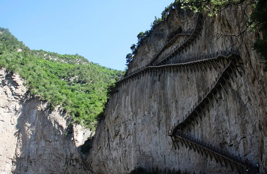 天橋: 此處為長300余米,寬不足1米的云中棧道。上離山頂200余米,高出云表;下距溝底300余米,懸于半空。多云天氣漫步橋頭,人從橋上過,云在腳下涌,平步青云,飄飄欲仙;仡^望柏龍、兔橋等景觀神奇,更有中國最險絕的軍事要塞石勒寨和唐太宗李世民為感恩太上老君所建的洞神宮。
