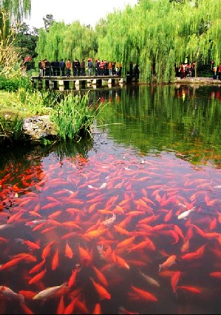 花港觀魚公園位于蘇堤南段以西,在西里湖與小南湖之間的一塊半島上。南宋時(shí),內(nèi)侍官允升曾在離這里不遠(yuǎn)的花家山下結(jié)廬建私家花園,園中花木扶疏,引水入池,蓄養(yǎng)五色魚以供觀賞怡情,漸成游人雜沓頻頻光顧之地,時(shí)稱盧園又以地近花家山而名以花港。宮廷畫師創(chuàng)作西湖十景組畫時(shí)將它列入其中。清康熙三十八年(一六九九),皇帝玄燁駕臨西湖,照例題書花港觀魚景目,用石建碑于魚池畔。后來(lái)乾隆下江南游西湖時(shí),又有詩(shī)作題刻于碑陰,詩(shī)中有句云:“花家山下流花港,花著魚身魚嘬花”。交通情況:乘K4、538、K599路蘇堤站下
