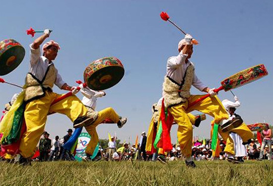 納頓節(jié)的儺戲是第一批青海省國(guó)家級(jí)非物質(zhì)文化遺產(chǎn),保存著較多北方民族薩滿(mǎn)文化的傳統(tǒng),同時(shí)又吸收了二郎神、關(guān)公崇拜等漢文化的內(nèi)容。當(dāng)土族人隨著鼓點(diǎn),踏著原始、粗獷的舞步又敲又喊時(shí),盡情高昂的吼聲會(huì)感染每一位觀眾。仔細(xì)聽(tīng),原來(lái)他們喊的是“大好”兩字,看熱鬧的人們都會(huì)隨聲高喊:“大好!”“大好!”仿佛一年的喜氣要在這“大好”聲中抒發(fā)出來(lái)。
