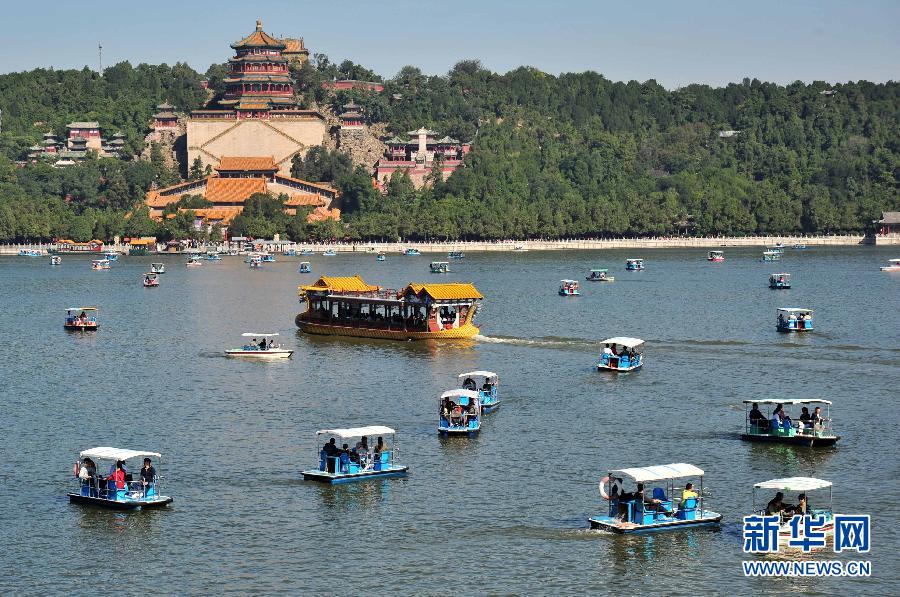 10月1日,游客乘船游覽北京頤和園。 當(dāng)日,北京市重點(diǎn)監(jiān)測(cè)的24個(gè)景區(qū)共接待游客80.4萬(wàn)人次,游客數(shù)量比9月30日的44.7萬(wàn)人次提升80%。據(jù)了解,今年十一黃金周,北京市旅游委啟用1000多個(gè)攝像頭監(jiān)測(cè)全市景區(qū)及周邊的客流、交通和安全狀況,并實(shí)時(shí)發(fā)布景區(qū)舒適度指數(shù)。