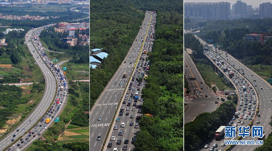 9月30日,京珠高速廣東段不少路段塞車嚴(yán)重(拼版照片)。當(dāng)日是今年中秋國慶黃金周的第一天,也是中國高速公路對(duì)小型客車實(shí)行免費(fèi)通行首日,全國各地客流、車流洶涌,各級(jí)有關(guān)部門正全面迎戰(zhàn)“最長黃金周”。據(jù)介紹,2012年中國傳統(tǒng)節(jié)日中秋節(jié)和國慶節(jié)連在了一起,連續(xù)8天的“最長黃金周”里,約有一半中國人——總計(jì)約7.4億人次,要通過公路、鐵路、民航等出行,創(chuàng)下同期出行新紀(jì)錄,中國交通管理部門承受巨大壓力。據(jù)預(yù)計(jì),黃金周期間,中國公路水路客運(yùn)量將達(dá)到6.6億人次,日均8250萬人次,較去年同期增長8.8%。鐵路方面,長假出行高峰日甚至“不亞于春運(yùn)”。9月27日至10月7日,全國鐵路預(yù)計(jì)發(fā)送旅客7540萬人,日均近700萬人。除了史無前例的長假,全國公路小客車節(jié)假日免費(fèi)通行政策的首度實(shí)施無疑將改變?cè)S多人出行的選擇,這也將給“最長黃金周”帶來不小的挑戰(zhàn)。