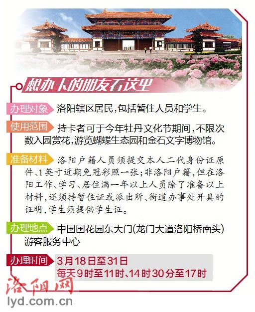 今年中國國花園對洛陽市民推出月票卡,辦理費(fèi)用每張30元,持卡者可于今年牡丹文化節(jié)期間不限次數(shù)入園賞花,免費(fèi)游賞蝴蝶生態(tài)園、金石文字博物展。