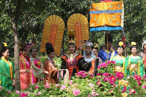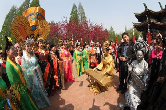4月5日,在河南洛陽中國國花園內(nèi),來自洛陽的“武皇”率隨從與來自鄭州的詩仙“李白”團(tuán)隊(duì)不期而遇,上演了女皇武則天與詩仙李白一同賞花的穿越劇。一邊是皇家儀仗華麗無比,一邊是全身涂滿油彩歌舞詩賦;讓在場的游客大飽眼福,爭相與古人合影留念。