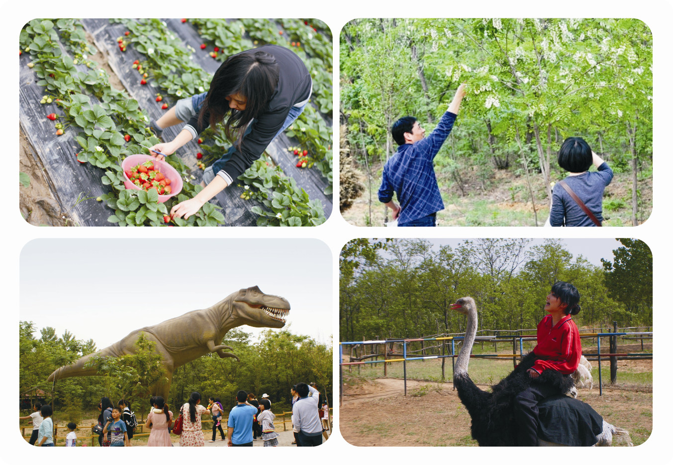 五一小長(zhǎng)假,正是鴕鳥園千畝槐花飄香,萬(wàn)畝草莓紅遍大地的時(shí)節(jié)。淡淡的槐香,彌漫在整個(gè)園區(qū),嫣紅的草莓,香甜誘人,游人樂(lè)在其中,看恐龍、賞槐花、摘草莓、吃燒烤,娛樂(lè)休閑,體驗(yàn)著2014鴕鳥園槐花草莓旅游文化節(jié)各種活動(dòng)的精彩。