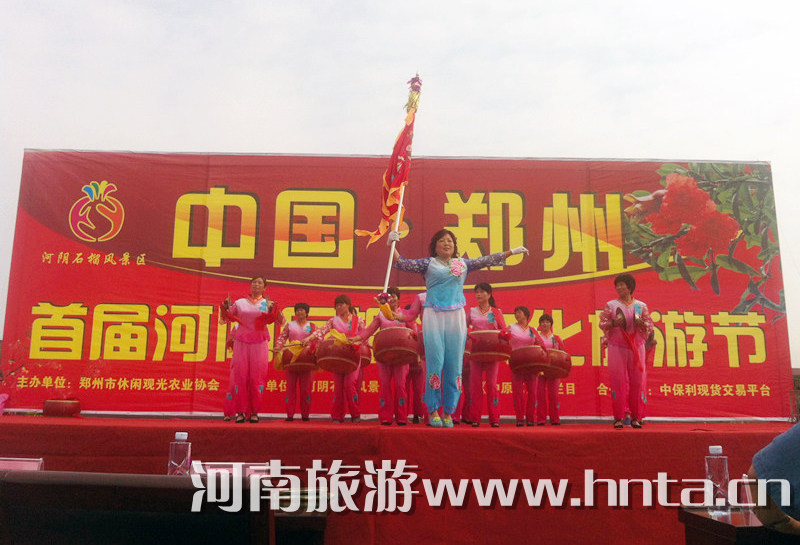 為了“弘揚河陰石榴產(chǎn)業(yè)文化,促進滎陽特色經(jīng)濟發(fā)展”,達到春季賞花,秋季品果,全方位宣傳、推介、提升河陰石榴品牌優(yōu)勢和知名度,帶動我市農(nóng)特產(chǎn)品和旅游產(chǎn)業(yè)發(fā)展,實現(xiàn)農(nóng)民增收的目標(biāo)。2014年6月1日,由鄭州市休閑觀光農(nóng)業(yè)協(xié)會主辦,河陰石榴風(fēng)景區(qū)、河南電視臺《中原名片》欄目組承辦的中國•鄭州首屆河陰石榴花文化旅游節(jié)開幕式在高村鄉(xiāng)劉溝村興盛莊園舉行。開幕式由河南大學(xué)鄭州校友會第二屆理事會副秘書長、鄭州市原文聯(lián)主席宋歌的致辭拉開序幕,接著滎陽市旅游和文物局黨組書記李國明發(fā)表致辭,滎陽市河陰石榴風(fēng)景區(qū)主任黃曉峰對本次活動作了詳細介紹。