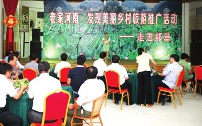 為充分發(fā)揮旅游業(yè)在“四個河南”中的積極作用,落實省委省政府關于城鄉(xiāng)一體化發(fā)展的工作部署,讓旅游業(yè)成為社會主義新農(nóng)村建設的重要載體,我省著力發(fā)展休閑農(nóng)業(yè)與鄉(xiāng)村游,推進農(nóng)業(yè)功能拓展和農(nóng)村產(chǎn)業(yè)結構調(diào)整,促進農(nóng)民就業(yè)增收。9月11日,由河南省旅游局、河南日報報業(yè)集團、河南省新聞出版廣電局等單位聯(lián)合組織發(fā)起的“老家河南·發(fā)現(xiàn)美麗鄉(xiāng)村”系列旅游推廣活動在郝堂正式啟動。副省長張廣智宣布活動啟幕。河南省旅游局局長寇武江,河南日報報業(yè)集團黨委書記、董事長、社長張建,信陽市委書記郭瑞民,信陽市市長喬新江,河南省旅游局副局長何琳,河南日報報業(yè)集團副總編輯王俊本出席活動。由我省知名作家李佩甫、王守國、何宏,書法家張良、畫家羅治安、網(wǎng)絡達人“大鵬背包走天下”等人組成的采風團,走進信陽郝堂村,以發(fā)現(xiàn)老家河南的鄉(xiāng)村之美。