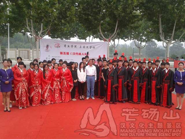 2014年9月24日,芒碭山漢文化主題景區(qū)漢禮儀師一行五人前往商丘學(xué)院為該校大一新生40名學(xué)子舉行"成人禮"。成人禮"在古代時又稱"冠禮"、"笄禮",是華夏青年重要的人生大禮,行禮年齡在18歲至20周歲。如今日本、韓國仍流行此禮,稱"成人禮",臺灣稱"成年禮"。高三或大一學(xué)生最適宜行此禮。成人禮主要通過"三加"(加時服、加祖服、加公冠),表達了"三明"(明發(fā)揚時代精神、明繼承華夏文化、明擔(dān)負國家使命),通過"三誦"(三次誦讀經(jīng)典章句),表達了"三成"(成人子、成國士、成君子)。行此禮后,正式成為"成年人",就要用成年人的標(biāo)準(zhǔn)要求自己。