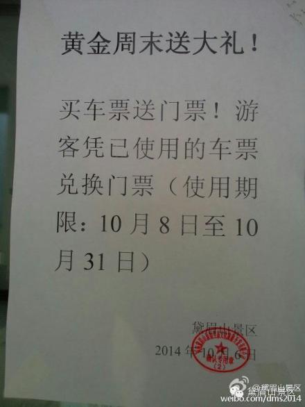 此外,黛眉山景區(qū)“車票換門票”活動正式啟動,凡是十一期間在黛眉山購買觀光車票的游客,均可憑車票換取黛眉山景區(qū)門票一張,門票使用期限為10月8日至10月31日!詳情以下圖為準: