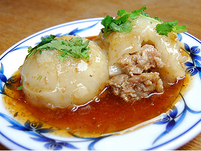 彰化肉圓,用地瓜粉、糯米做成的外皮,經(jīng)過高溫悶煮,皮QQ彈彈,內(nèi)陷是採用豬后腿肉,口味鮮甜,再加上老板的祖?zhèn)飨懔希有一些辣醬等等,實在好吃到爆。