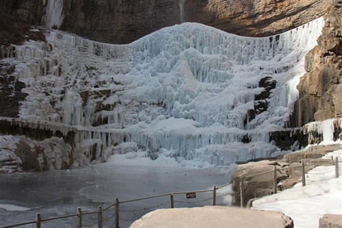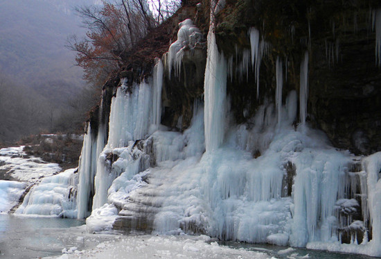 夏看天瀑奇觀,冬賞銀河倒掛。沿著景區(qū)小道走到峽谷盡頭,就是欣賞天然冰雕的地方。這里好似“廣寒宮”一般,冰柱晶瑩剔透,冰花燦爛怒放,各種冰瀑、冰柱、冰墻、冰燈、冰簾呈現(xiàn)在眼前,好一個(gè)冰清玉潔的世界!