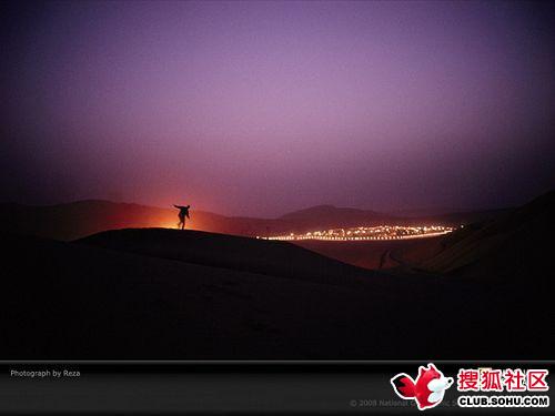 9、遠(yuǎn)處的謝巴赫油田所發(fā)出的光將沙特阿拉伯的天空映成了紫紅色,一名男子則在附近的一座沙丘上跳舞。沙特阿拉伯擁有全球已探明石油儲(chǔ)量的1/4。