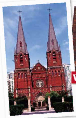 紅色的磚墻,白色的石柱,高聳入云的鐘樓,這座壯麗宏偉的天主教堂,風(fēng)格為歐洲中世紀(jì)哥特式,以立柱和雕塑而聞名。教堂內(nèi)由蘇州金山石雕琢的64 根立柱負(fù)有盛名。堂身上有一輪盤式的十字架,生命恰如駕馭輪盤,一個(gè)多么精彩的比喻。