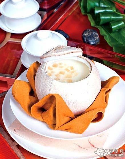 椰盅燉雪蛤:用整只椰子燉雪蛤,奶香濃郁,是女孩子滋補(bǔ)佳品。