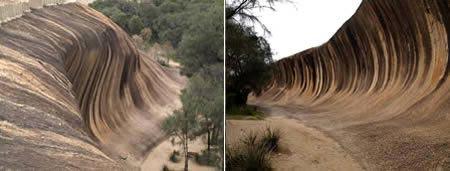 澳大利亞西部的波浪巖是天然巖層。由于它像高高的海浪因而得名。露出地面的部分占地幾公頃,“浪潮”的部分巖石高約15米,長(zhǎng)約110米。照片中顯示的是罕見巖石墻。