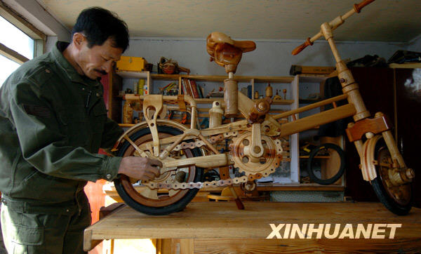 今年52歲的遼寧省鐵嶺市清河區(qū)貨郎屯農(nóng)民孫立學(xué),經(jīng)過3個(gè)月的研制,制作出一輛除軸承、輪胎等零件外,大部分由木頭做成的自行車。車高95厘米,重量16公斤,可承載近200斤的重量。新華社記者 姚劍鋒 攝