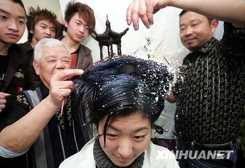 4月7日,發(fā)型師對模特頭上的西湖十景之一“斷橋殘雪”景觀進(jìn)行最后的修飾。