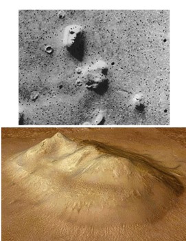 2003年,歐洲宇航局發(fā)射了“火星快車號”宇宙飛船,科學(xué)家結(jié)合該宇宙飛船高清晰立體攝像儀的觀測數(shù)據(jù)和“火星之臉”的3D圖像進行了深入分析,最終證實之前的人類面孔只是太陽光線照射和拍攝角度不同所形成的,如圖下面照片所示,山丘殘余部分形成于山崩滑體和較早的山丘殘余部分,并沒有呈現(xiàn)出具體的面孔形狀。