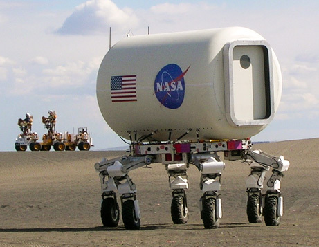 美國(guó)宇航局的“全地形六腿地外探測(cè)者”(ATHLETE)機(jī)器人背著一個(gè)登月艙樣品在美國(guó)莫哈韋沙漠國(guó)家公園附近的月球基地進(jìn)行測(cè)試。“全地形六腿地外探測(cè)者”機(jī)器人是即將供宇航員重返月球使用的新一代裝備之一,經(jīng)過(guò)特殊設(shè)計(jì),它將是完全成熟的機(jī)器人,能在未來(lái)的月球任務(wù)中穿越起伏不平的地形,并能攀越極其崎嶇或者陡峭的地形。而且,它還能將未來(lái)的月球基地設(shè)施通過(guò)語(yǔ)音或手勢(shì)指令搬運(yùn)到指定地點(diǎn)。美國(guó)宇航局表示,ATHLETE幾乎完全勝任火星的前線工作。