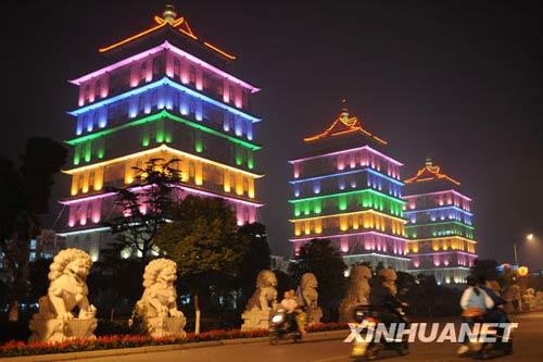 一輛輛摩托車從華西塔群邊駛過華西村共有大大小小10座塔,是華西村的標(biāo)志性建筑。