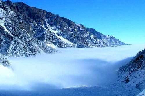 海螺溝冰川是貢嘎山東坡眾多冰川中的一條,尾端伸入到原始森林區(qū)達6千米,海拔只有2850米,是地球上同緯度的冰川中海拔最低的。冰川的雪粒盆是整個冰川的源泉,盆內(nèi)冰雪積累到一定程度,就會翻越盆沿形成巨大雪崩,故雪粒盆雖美麗神秘,卻只可遠觀不可靠近。盆的邊緣是我國已知最大的冰瀑布,高1080米,寬500-1100米,晶瑩剔透,雄奇無比。