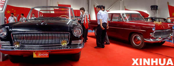 6月8日,參觀者在觀看展出的紅旗轎車(左)和東風轎車(右)。
