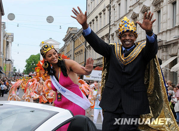 6月13日,在芬蘭首都赫爾辛基舉行的第19屆桑巴狂歡節(jié)上,“狂歡王”和“王后”行進(jìn)在游行隊(duì)伍的前列。