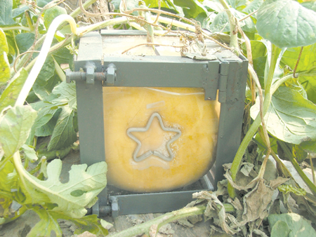 怪形西瓜何以能夠賣到100元一個呢?昨日,在方形西瓜的種植者林小三的西瓜大棚里,記者見到了他們培育的怪形西瓜,看起來一個瓜最多不會有10斤重,但是它們都是生長在一個正方形的模具里,從模具外邊可以看到西瓜不僅長成了方形,而且在西瓜的平面上還有各種圖案,有的是五角星,有的是英文字母,還有一個西瓜四面都有字,連起來是“生日快樂”4個字。