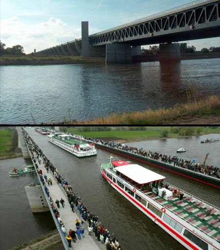 這座長度達(dá)918米的可供船只在其上航行的跨河水道橋于1997年動(dòng)工,歷時(shí)6年完成,于2003年開始投入使用。它將東部的馬格德堡附近的米特蘭德運(yùn)河與西部的易北——哈維爾運(yùn)河跨越易北河連接了起來。既有行人行走其上,又有船只航行,構(gòu)成了這座橋的奇妙景觀。