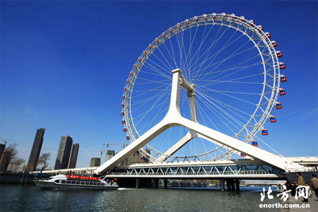 位于天津的永樂橋,兼具交通和觀光功用,橫跨海河,它的特別之處在于橋上矗立著一個名為“天津之眼”的高大雄偉的觀光摩天輪,輪外裝掛著共48個透明觀光艙,每個觀光艙可容納8人,可供384人同時觀光,游客乘坐摩天輪最高可達(dá)到120米的高空,盡享天“輪”之樂。