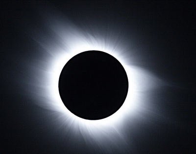 一旦太陽被完全遮住,你可以看到日冕的整個光環(huán),它的亮度和滿月差不多。通常,因為藍(lán)色的太空你看不到它。如果你在大氣上方的軌道,你可能得擋住太陽明亮的部分去看那道光環(huán)。這正是繞軌運行的太陽觀測站所做的事情。它們可以用神秘的圓盤制造假日食,并在任何有需要的時候觀察那道光環(huán)。