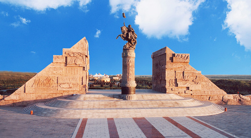 “山”字型的建筑,猶如巨大顛峰至頂劈開,圣山如崖,壁刻粗曠豪放的13世紀(jì)蒙古文字和草原巖畫,一段段史實(shí)映入眼簾。成吉思汗躍馬雕像,矗立中央,英武神威,直入蒼穹,門景顯示出了開天辟地、氣壯山河的宏偉景觀是最具特色的蒙古文化門景。