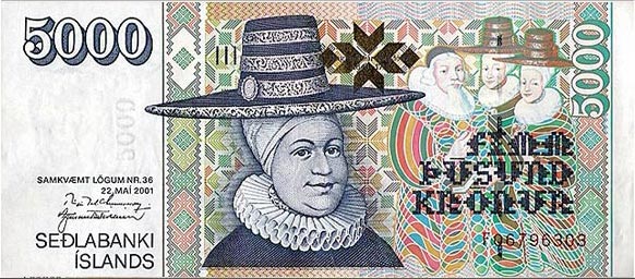冰島克朗是冰島的官方貨幣,在冰島語中是“皇冠”的意思,紙幣面額有100克朗、500克朗、1000克朗、2000克朗以及5000克朗等。其中5000克朗面值的紙幣上的人物是拉格希爾·榮斯蒂爾(1646年-1715年),她曾是兩位冰島主教的妻子,還是一位著名的裁縫。紙幣背面是榮斯蒂爾正在教兩名學生學習的情景。