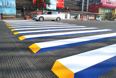浙江省臺(tái)州立體彩色斑馬線,是通過藍(lán)白黃三色相間彩條,使平面的斑馬線呈現(xiàn)立體感,通過給行人或司機(jī)強(qiáng)烈的視覺刺激,從而增強(qiáng)對(duì)車輛行人的交通警示性。