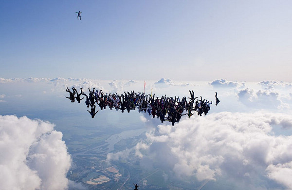 據英國媒體8月2日報道,美國上空108名傘降者從1.8萬英尺(約5.48公里)高空以180英里每小時時速跳下,并在空中組成各種圖形,欲打破世界紀錄。