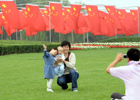 9月28日,許多路人在北京海淀公園東門(mén)國(guó)旗“旗陣”前駐足觀看或是拍照留念。這片由150面國(guó)旗組成的旗陣從9月25日亮相后,成為北京街頭的新景觀。據(jù)了解,這組旗陣長(zhǎng)88米,寬15米,由6個(gè)大小相同的小旗陣組成,寓意新中國(guó)60歲生日的到來(lái)。新華社記者唐召明攝