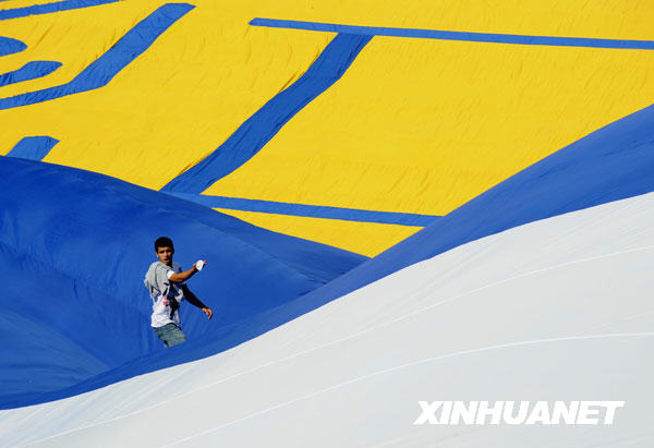 9月17日,一名工作人員站在耶路撒冷的泰迪足球場(chǎng)展開(kāi)的世界最大的旗幟上。