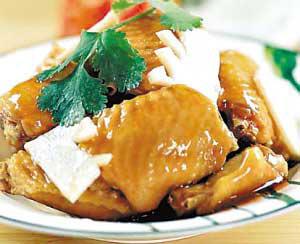 貴妃雞:這是上海名廚獨創(chuàng)的一道川菜肴。它是用肥嫩的母雞作為主料,用葡萄酒作調料,成菜后酒香濃郁美味醉人,有“貴妃雞”之意。在西安還有一種“貴妃雞”。它以雞脯肉、蔥末、料酒、蘑菇等為餡的餃子,形似飽滿的麥穗,皮薄餡嫩,鮮美不膩。