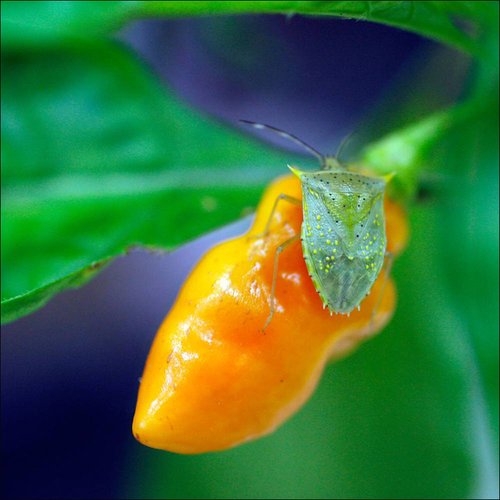 一只椿象緊緊抓住樹上的辣椒,仿佛在說,我喜歡吃辣!