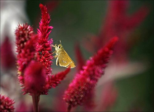 在印度斯里那加的一個花園里,一只蛾子落在花朵上。
