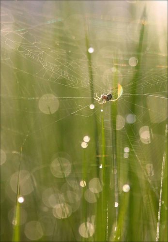 在印度一個(gè)村莊的稻田里,早晨的露水清晰可見。一只小蜘蛛正在稻子上結(jié)網(wǎng)。