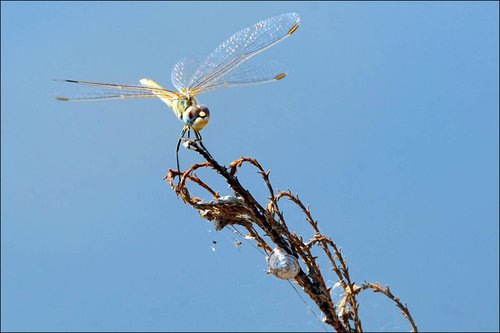 在土耳其的伊茲密爾禽鳥天堂里,一只蜻蜓正站在一株野草的頂端。