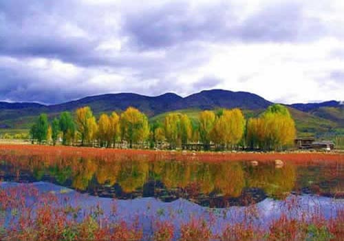 那各種顏色組合下的景觀,讓你除了按下快門外,已驚嘆得毫無語言了:艷紅艷紅的紅草猶如一片火云在池塘里翻騰燃燒著,鋪滿了整片大地,池塘旁是那金色的楊樹林在微風(fēng)中搖曳生姿,遠(yuǎn)處是已經(jīng)泛黃的牧場(chǎng)和連綿起伏的山巒,幾頭悠閑的牛在慢悠悠地吃著草,毫不理會(huì)游人的大呼小叫……無論何種角度,取景框里永遠(yuǎn)是一副絕美的圖畫。